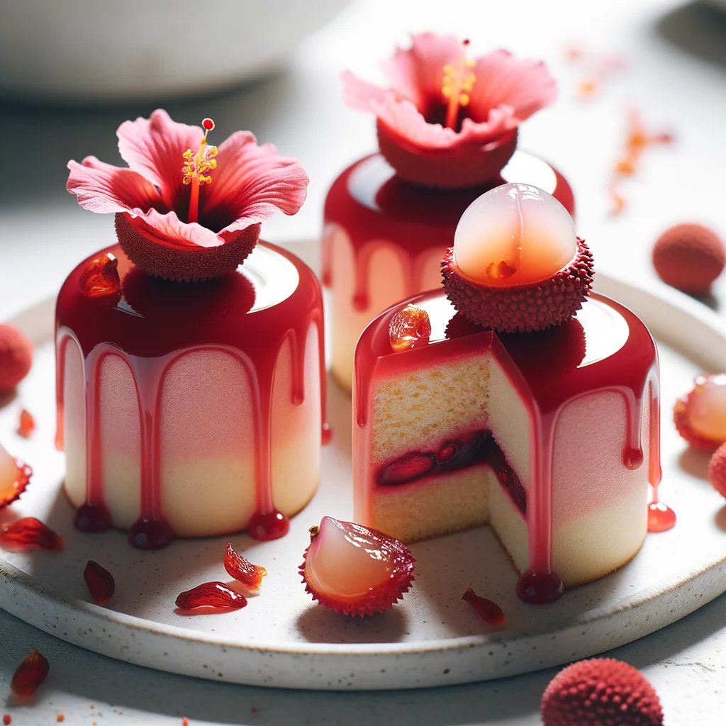 - 8.Fill petit gâteau silicone molds halfway with lychee mousse. Press a frozen hibiscus insert into each center, then top with a cake round. Freeze at least 4 hours.